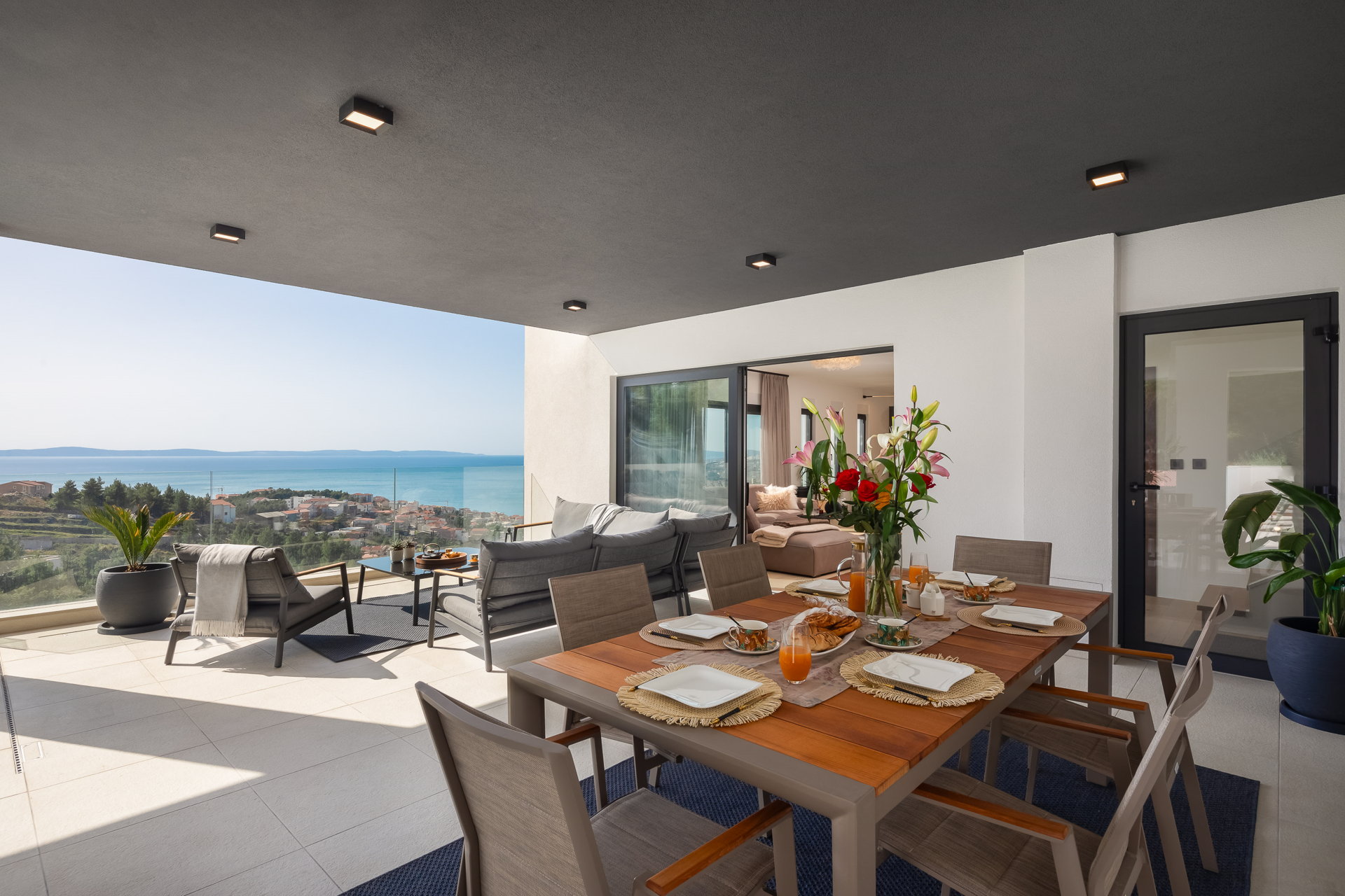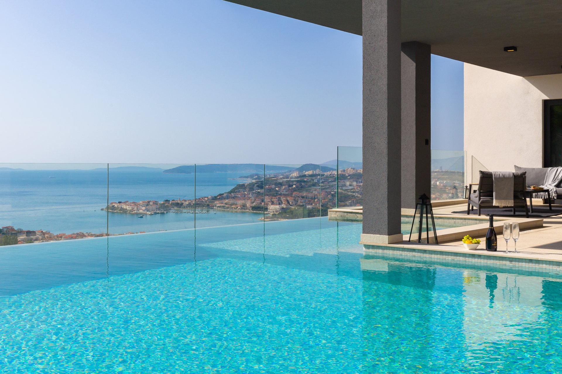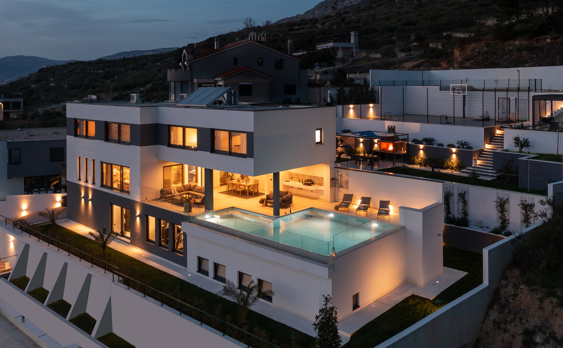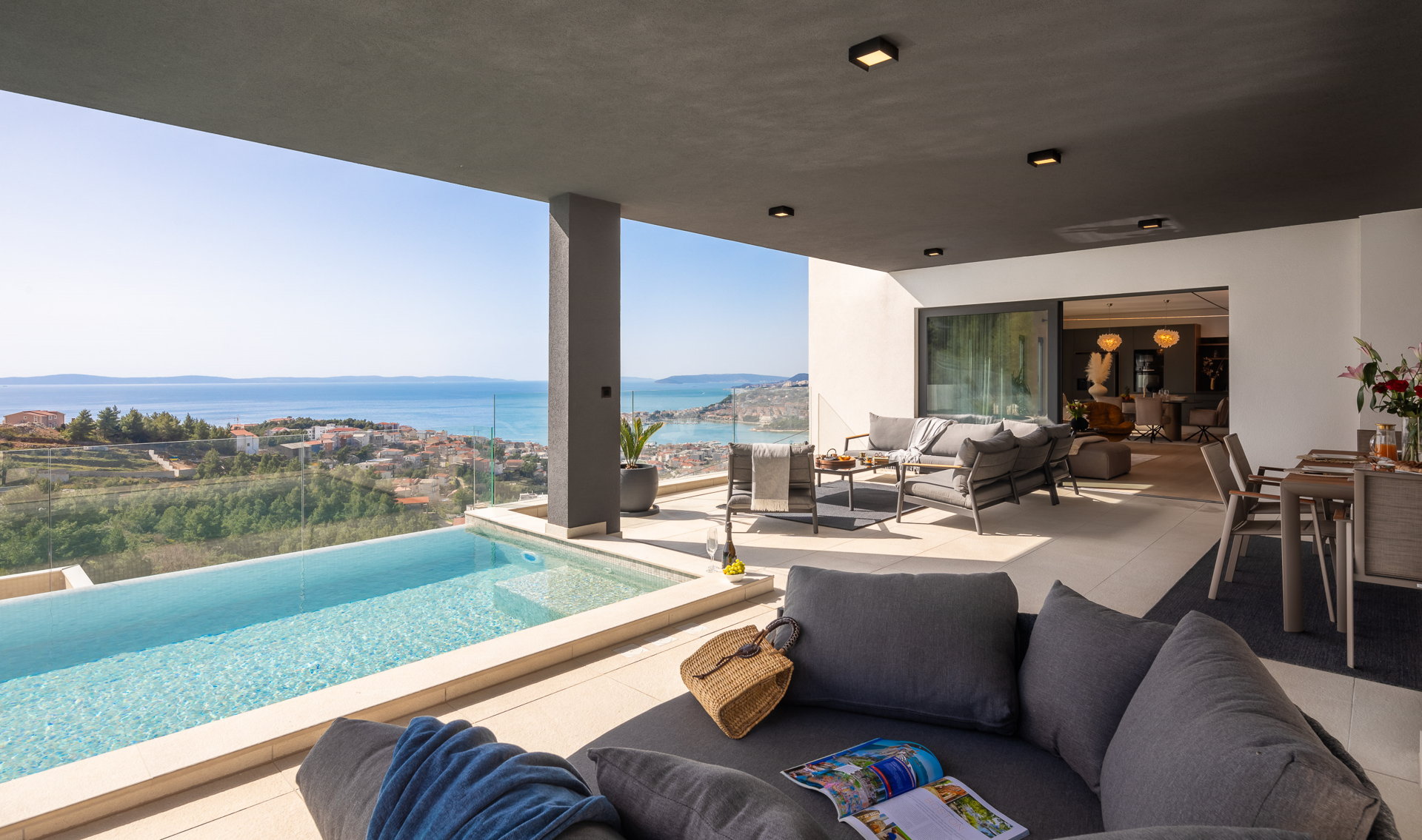 This luxury villa for sale in Podstrana, located just minutes from Split, offers exceptional privacy, generous outdoor space, and premium lifestyle amenities. Set on a 1,600 m² private plot with 450 m² of living space, the property features four en-suite bedrooms, elegant open-plan interiors, and expansive terraces designed for refined Mediterranean living.
