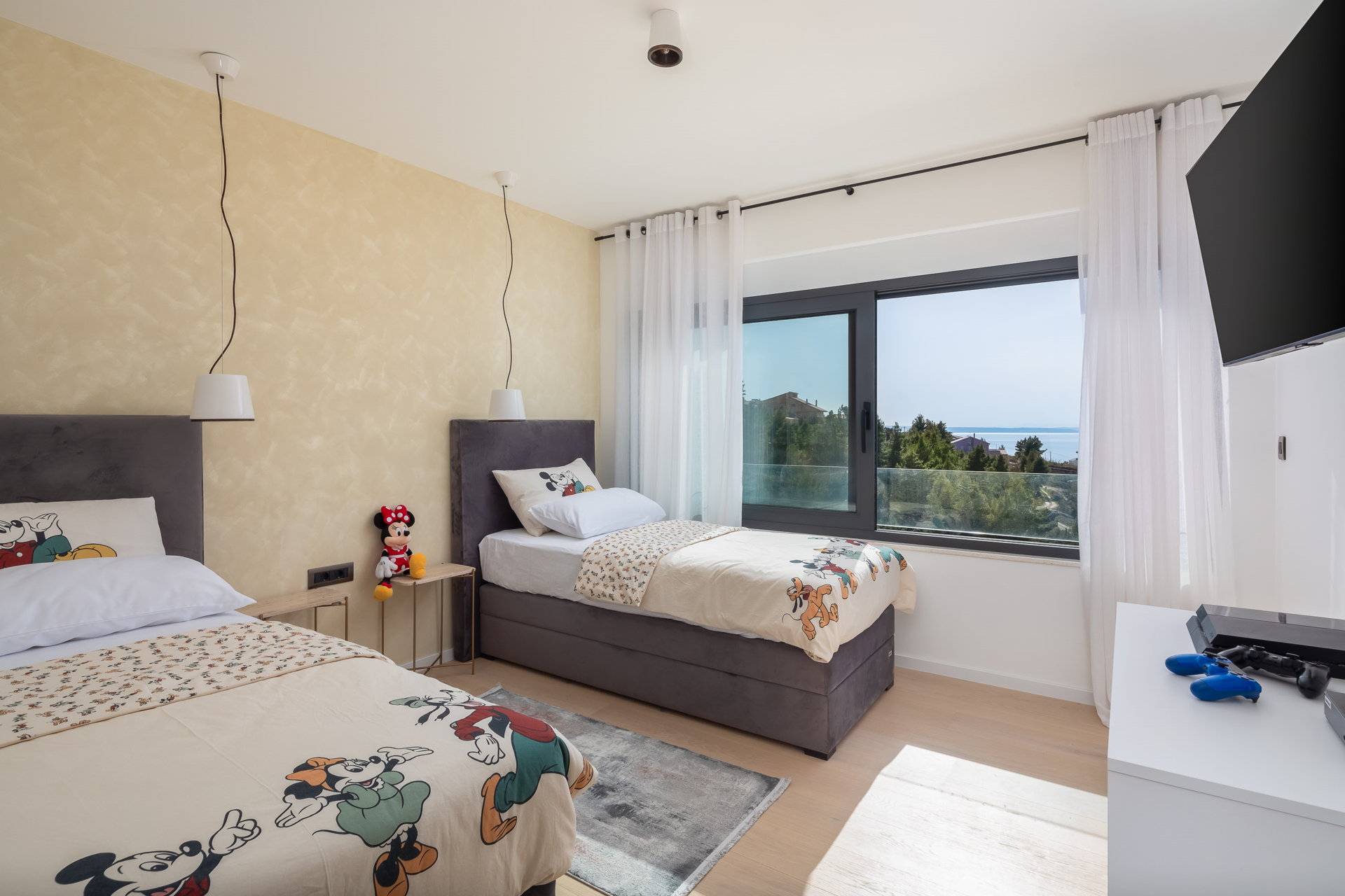 Bedroom 1 - twin beds, en-suite bathroom, sea view