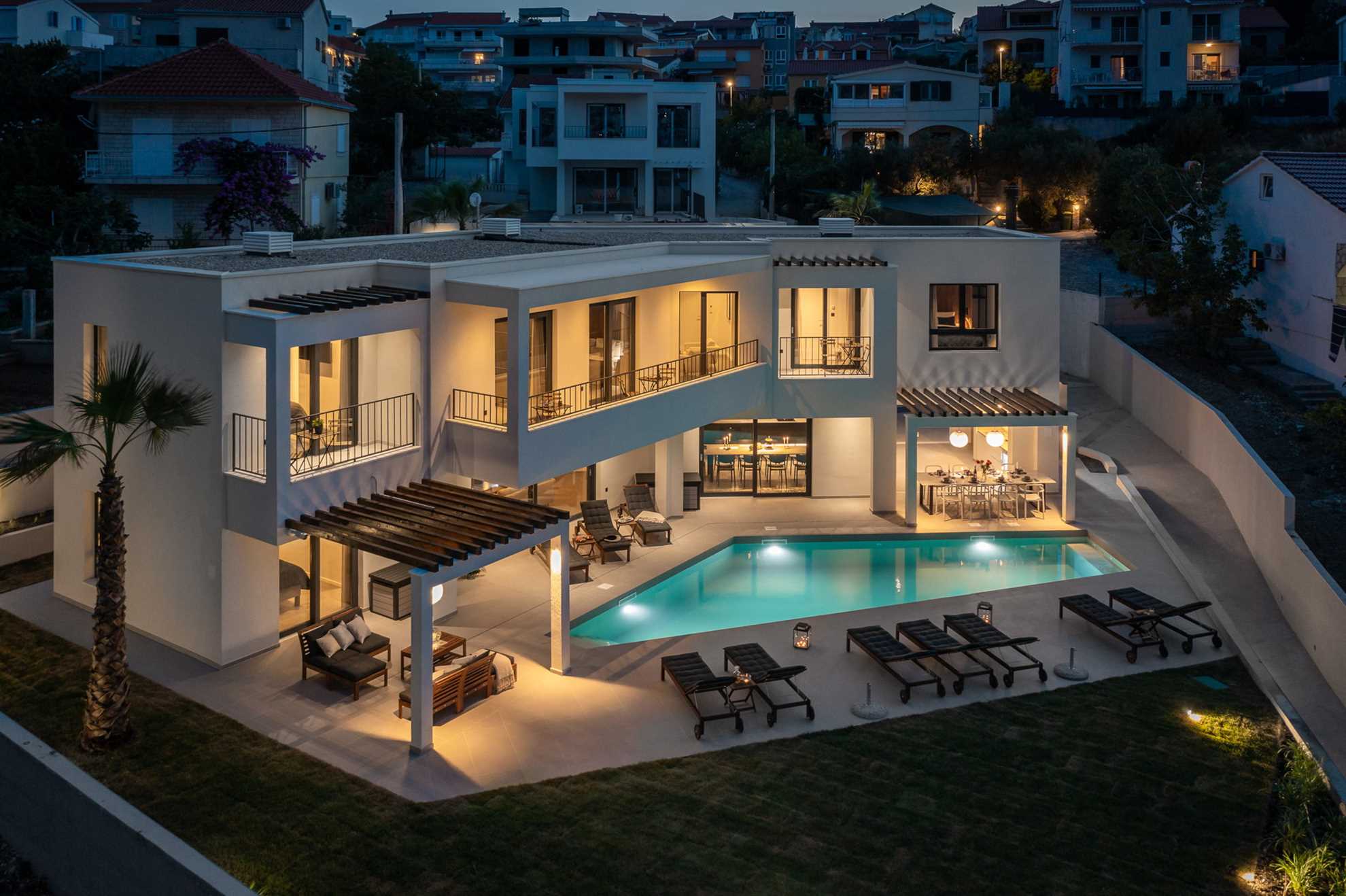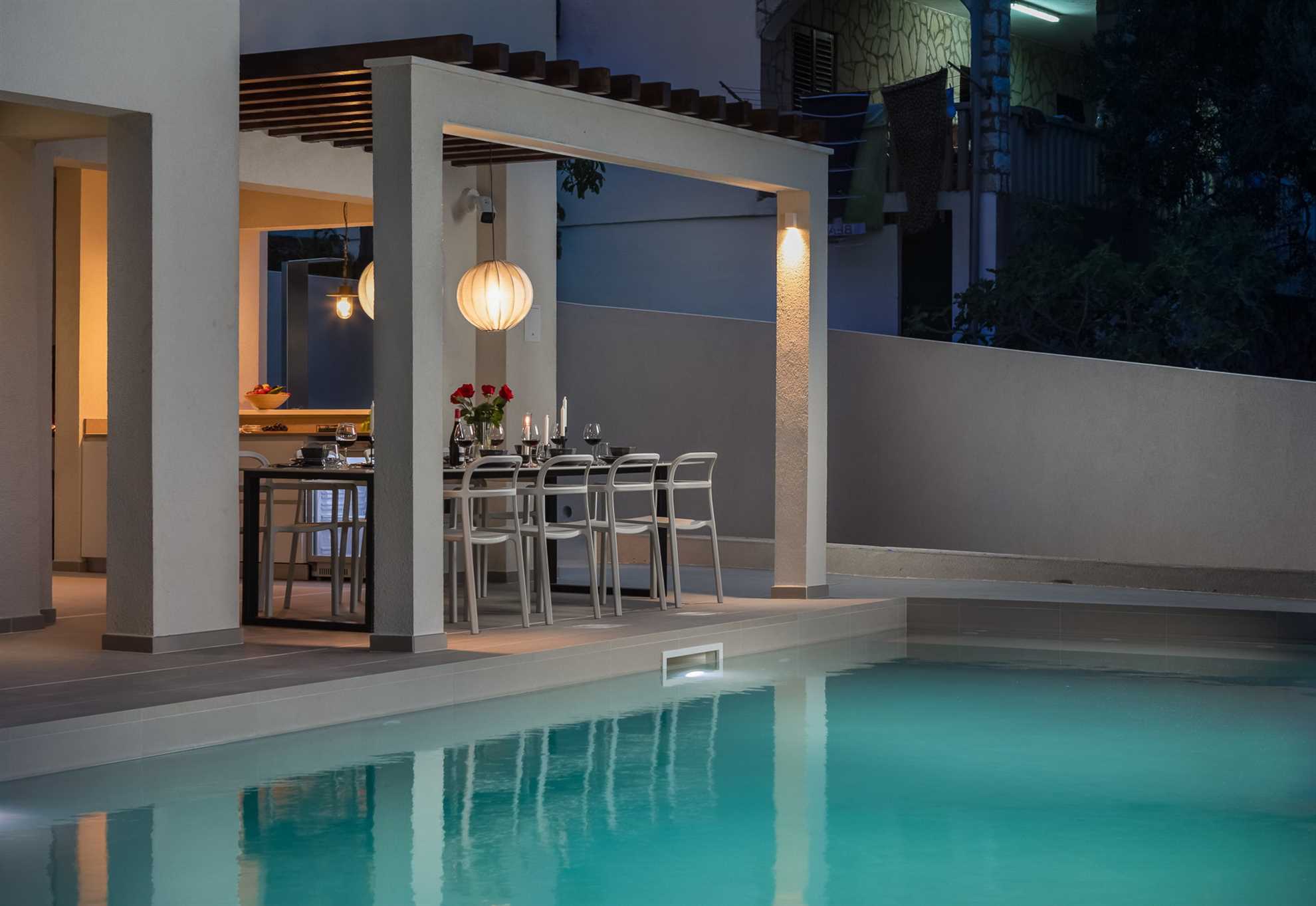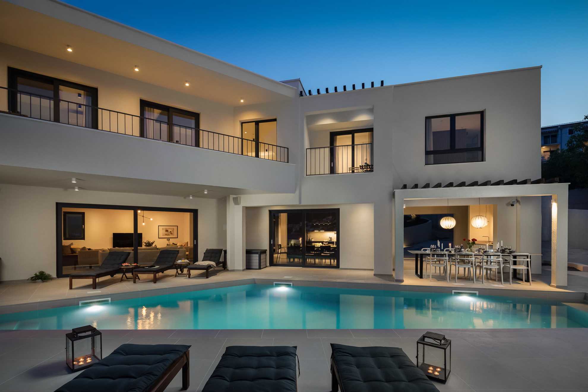 A spacious terrace with a private swimming pool and outdoor dining area enhances both lifestyle comfort and rental potential. The villa is ideally positioned near Trogir Old Town, international airports, and renowned Adriatic beaches, making it an excellent choice for personal use or investment.
